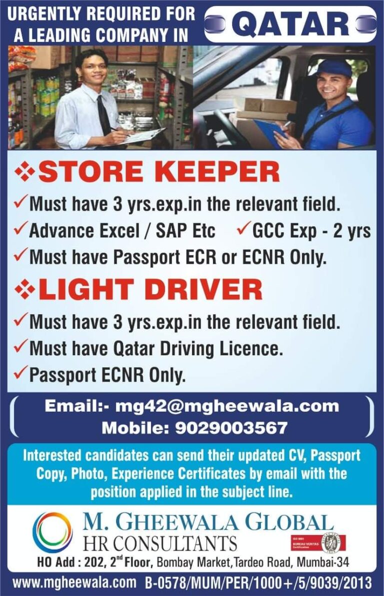 URGENTLY REQUIRED FOR A LEADING COMPANY INQATARSTORE KEEPER Must have 3 yrs.exp.in the relevant field.✓ Advance Excel / SAP Etc …