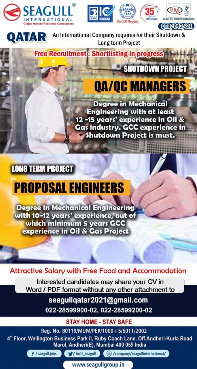 An International Company requires for their Shutdown &Long term ProjectFree Recruitment : Shortlisting in progte•sSHUTDOWN PROJECTQAIQC MANAGERSDegree in Mechanical•Engineering with …