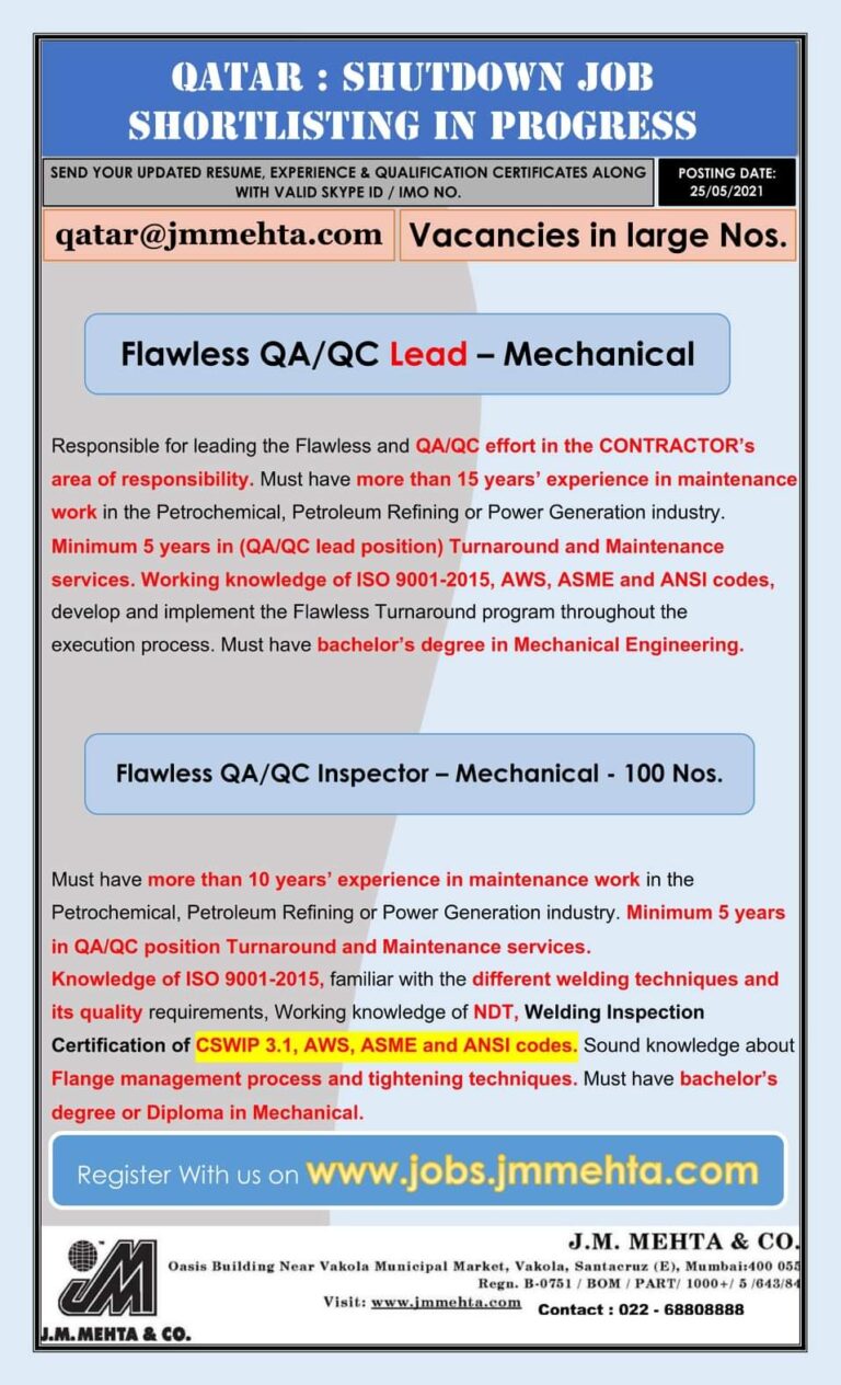 URGENT REQUIREMENT FOR ALOCATION QATARLEADING KOREAN COMPANYSHORTLISTING IN PROGRESS/ONLINE INTERVIEW SHORTLYCONTACT OUR MUMBAI/COCHIN/CHENNAVVIZAG/GOA OFFICESPOSITION:-*PROJECT ENGINEERBACHELOR DEGREE IN RESPECTIVE FIELD .ABOUT …