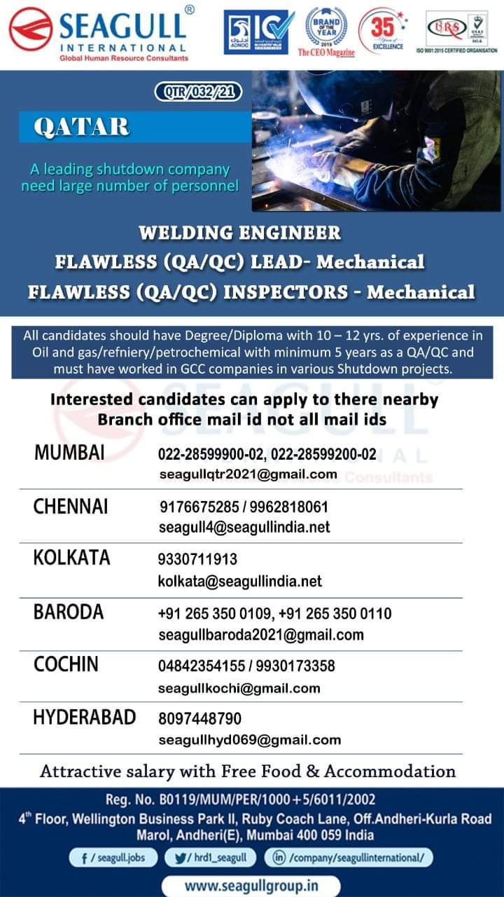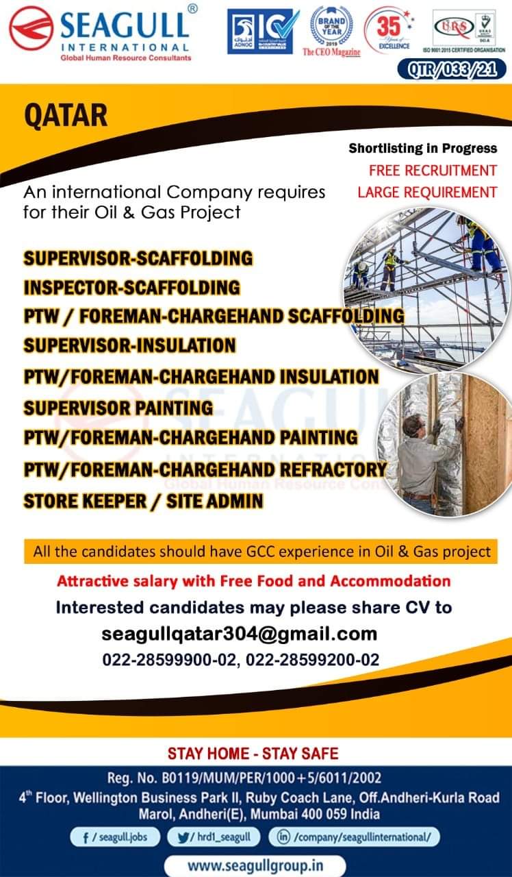 QATARAn international Company requiresfor their Oil & Gas ProjectSUPERVISOR-SCAFFOLDINGINSPECTOR-SCAFFOLDINGQTR/Æ/2-1Shortlisting in ProgressFREE RECRUITMENTLARGE REQUIREMENTPTW / FOREMAN-CHARGE HAND SCAFFOLDINGSUPERVISOR-INSULATIONPTW/FOREMAN-CHARGE-HAND INSULATIONSUPERVISOR PAINTINGPTW/FOREMAN-CHARGE HAND …