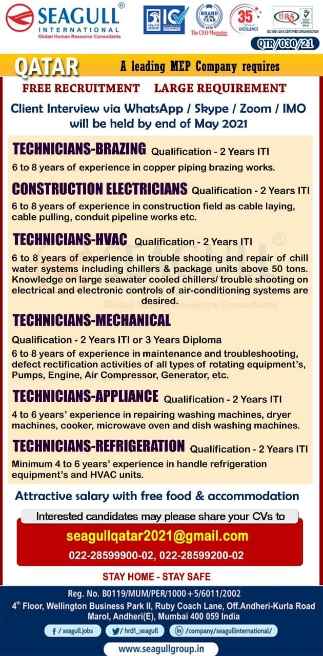 QATARA leading MEP Company requiresFREE RECRUITMENT LARGE REQUIREMENTClient Interview via WhatsApp I Skype / Zoom I IMOwill be held by …