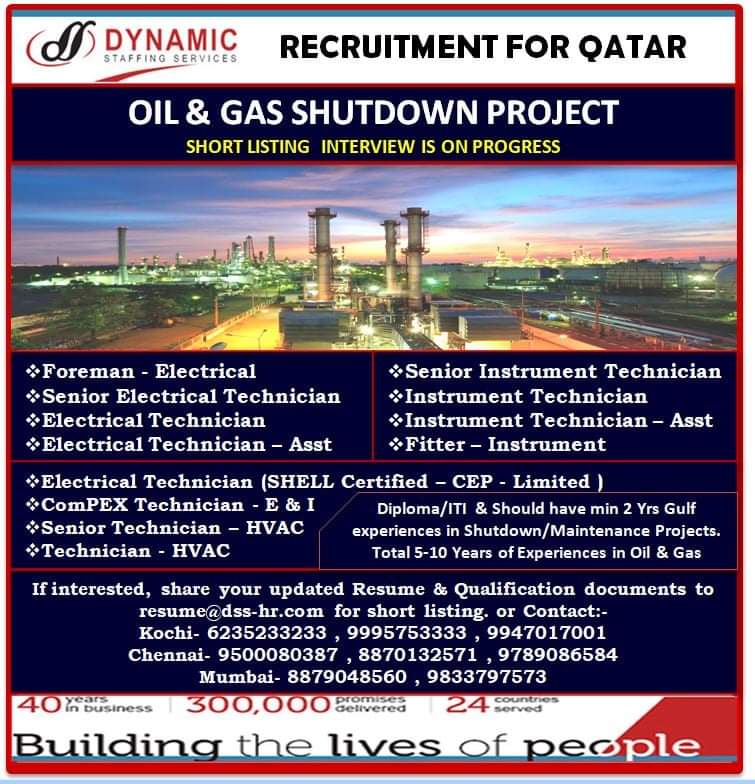 RECRUITMENT FOR QATAROIL & GAS SHUTDOWN PROJECTSHORT LISTING INTERVIEW IS ON PROGRESS*Foreman – Electrical Senior Electrical Technician*Electrical Technician*Electrical Technician — …