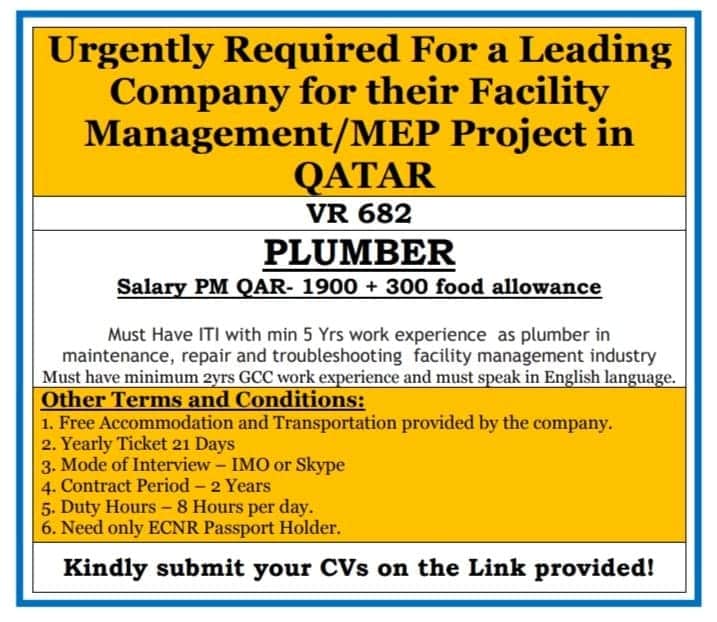 Urgently Required For a LeadingCompany for their FacilityManagement/MEP Project in QATARVR 682 PLUMBER – Apply hereSalary PM QAR- 1900 + …