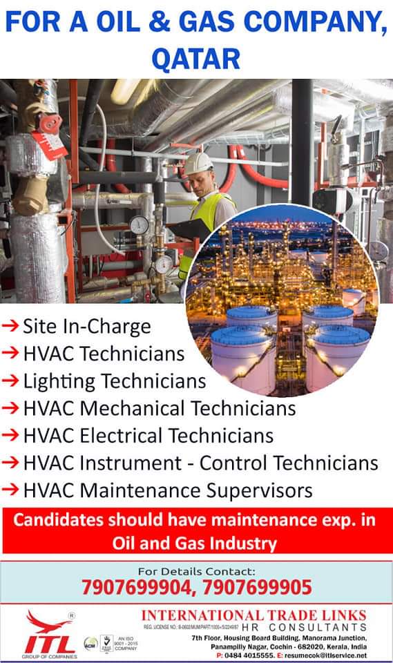 FOR A OIL & GAS COMPANY,QATAR*Site In-ChargeHVAC Technicians-Y Lighting TechniciansHVAC Mechanical TechniciansHVAC Electrical TechniciansHVAC Instrument – Control TechniciansHVAC Maintenance SupervisorsCandidates …