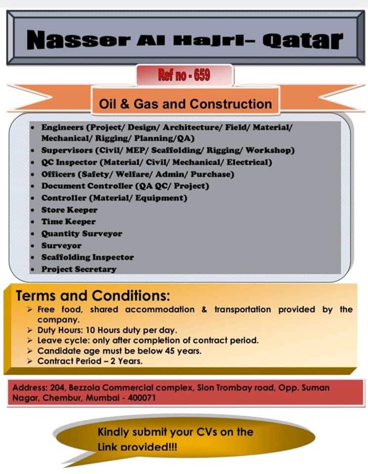 Nasser A1 QatarOil & Gas and Construction,Engineers (Project/ Desi”i/ Architecture/ Field/Mechanical/ Rigging/ Planning/QA) – Apply hereSupervisors (Civil/ MEP/ Scaffolding.’ Rigging.’ …