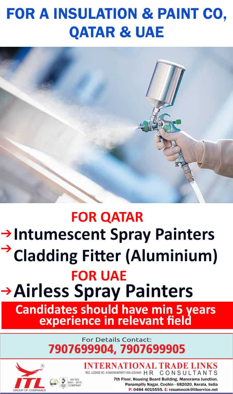 FOR QATARIntumescent Spray PaintersCladding Fitter (Aluminium)FOR UAE*Airless Spray PaintersCandidates should have min 5 yearsexperience in relevant fieldFor Details Contact:7907699904, 7907699905INTERNATIONAL …