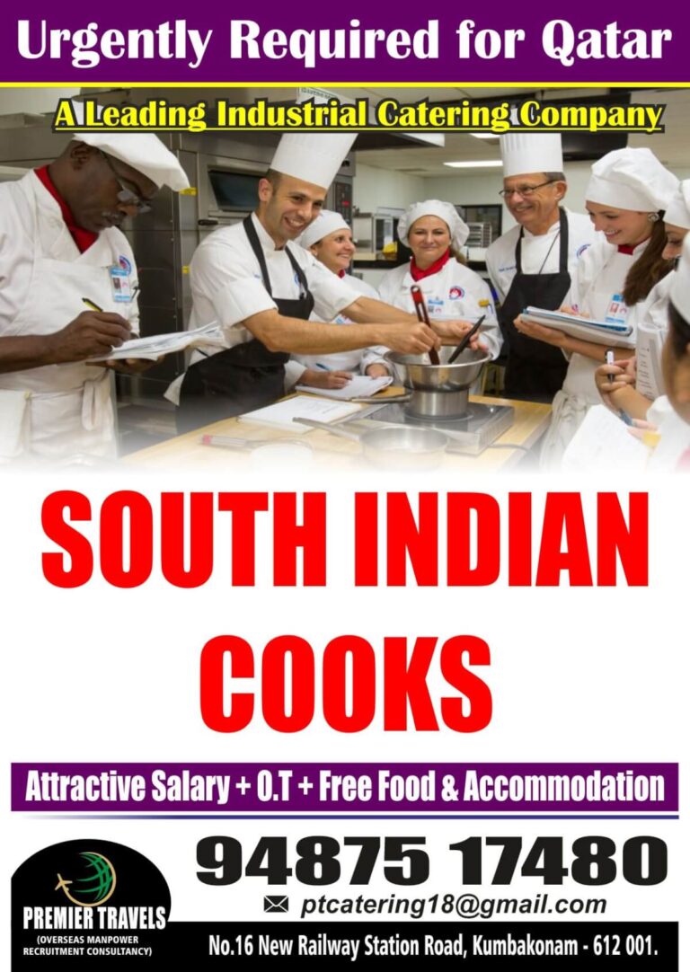 Urgently Required for QatarSOUTH INDIAN COOKSAttractive Salary + O.T + Free Food a Accommodation94875 17480ptcatering18@gmail.comNo.16 New Railway Station Road, Kumbakonam …