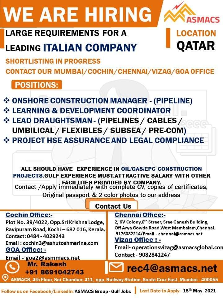 LARGE REQUIREMENTS FOR ALOCATIONQATARLEADING ITALIAN COMPANYSHORTLISTING IN PROGRESSCONTACT OUR MUMBAI/COCHIN/CHENNAI/VIZAG/GOA OFFICEPOSITIONS: ONSHORE CONSTRUCTION MANAGER – (PIPELINE) LEARNING & DEVELOPMENT COORDINATOR …