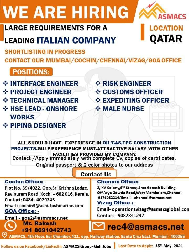 LARGE REQUIREMENTS FOR ALOCATIONQATARLEADING ITALIAN COMPANYSHORTLISTING IN PROGRESSCONTACT OUR MUMBAI/COCHIN/CHENNAI/VIZAG/GOA OFFICEPOSITIONS: INTERFACE ENGINEER PROJECT ENGINEER TECHNICAL MANAGER HSE LEAD- ONSHOREWORKS …