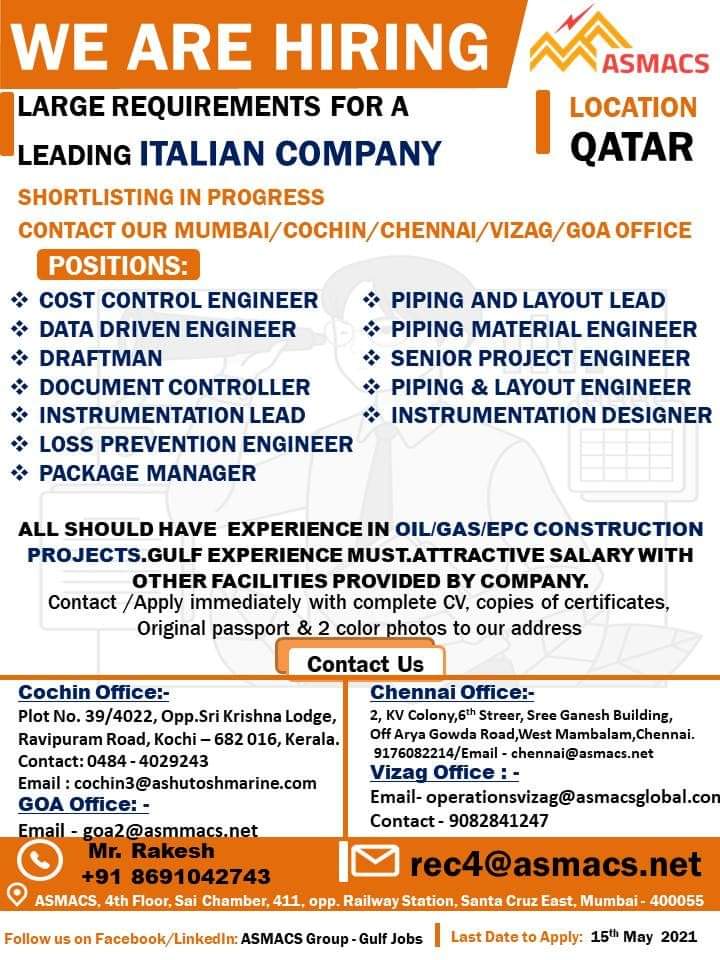 LARGE REQUIREMENTS FOR ALOCATION QATARLEADING ITALIAN COMPANYSHORTLISTING IN PROGRESSCONTACT OUR MUMBAI/COCHIN/CHENNAI/VIZAG/GOA OFFICEPOSITIONS:COST CONTROL ENGINEERDATA DRIVEN ENGINEER DRAFTSMANDOCUMENT CONTROLLER INSTRUMENTATION LEADLOSS …