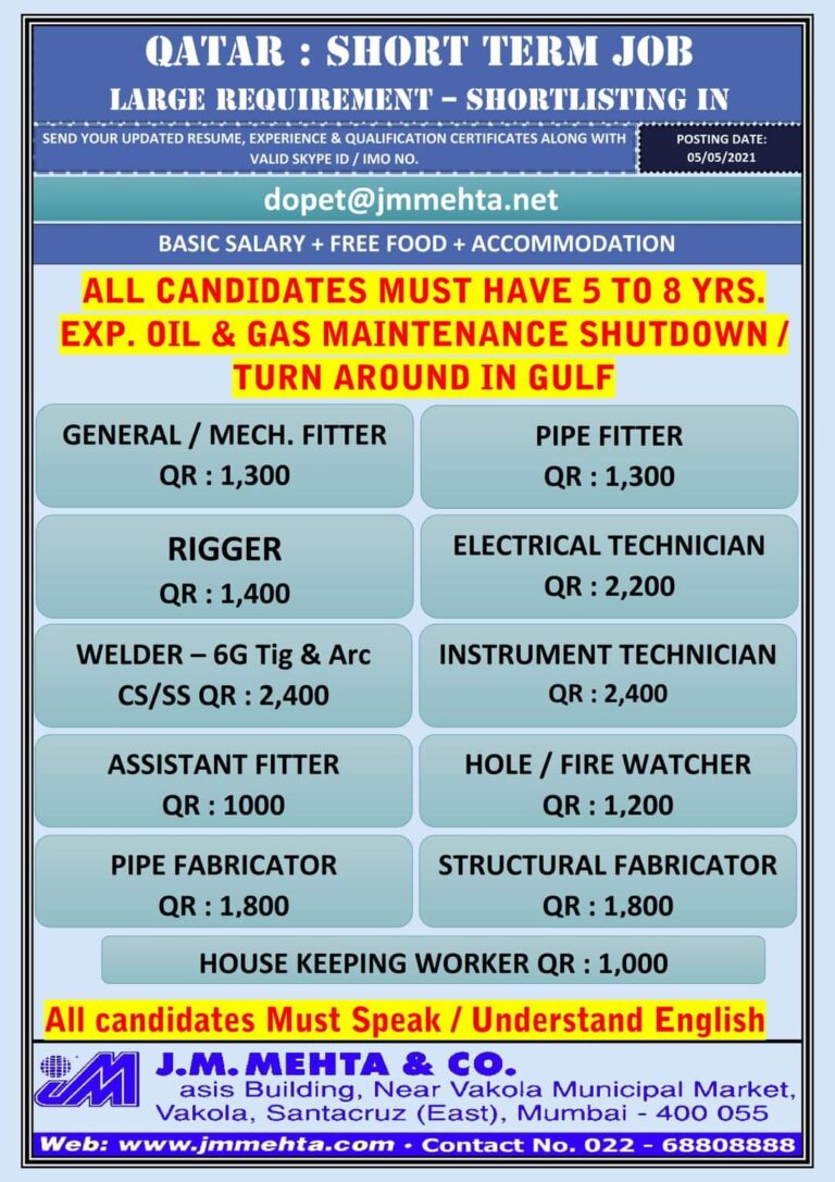 QATAR : TERM JOBLARGE REQUIREMENT – SHORTLISTING INSEND YOUR UPDATED RESUME, EXPERIENCE & QUALIFICATION CERTIFICATES ALONG WITHVALID SKYPE ID / …