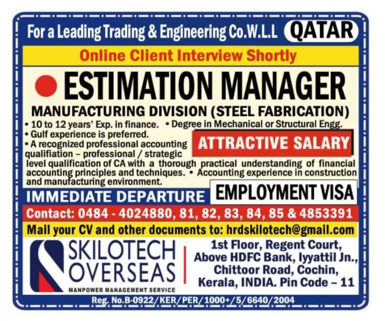 Online Client Interview Shortlyo ESTIMATION MANAGERMANUFACTURING DIVISION (STEEL FABRICATION)• 10to 12 years’ Exp. in finance. • Degree in Mechanical or …