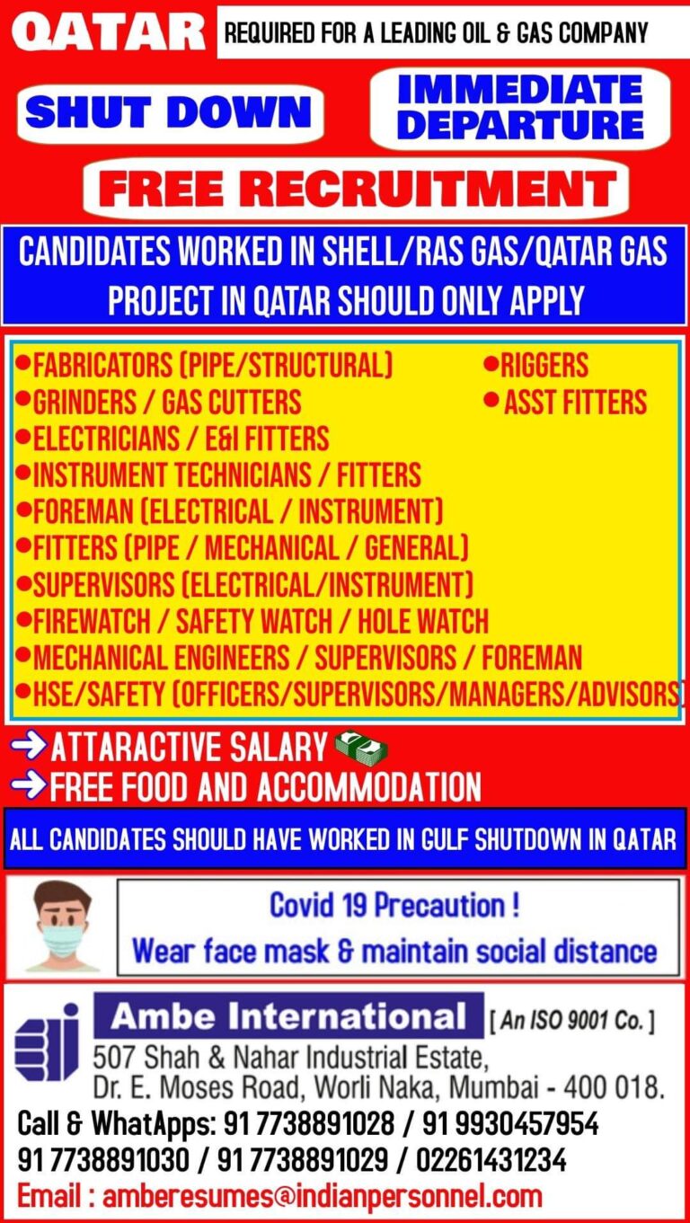 QATAR ,REQUIRED FOR A LEADING OIL & GAS COMPANYIMMEDIATESHUT DOWN DEPARTUREFREE RECRUITMENTCANDIDATES WORKED IN SHELL/RAS GAS/QATAR GASPROJECT IN QATAR SHOULD …
