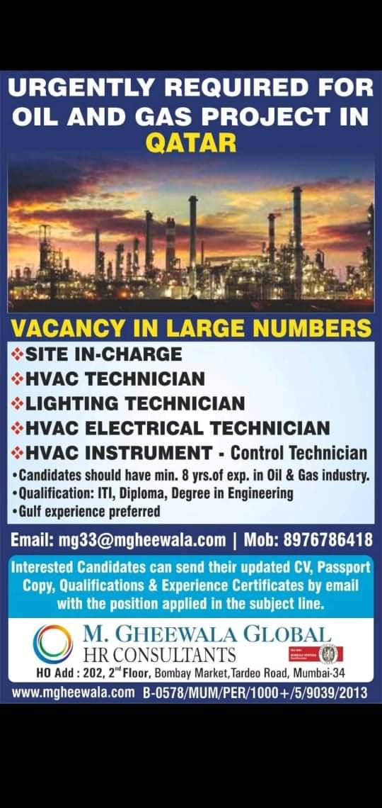 URGENTLY REQUIRED FOROIL AND GAS PROJECT INQATARVACANCY IN LARGE NUMBERS*SITE IN-CHARGE*VAC TECHNICIAN•.LIGHTING TECHNICIAN•HVAC ELECTRICAL TECHNICIAN.HVAC INSTRUMENT • Control Technician•Candidates should …