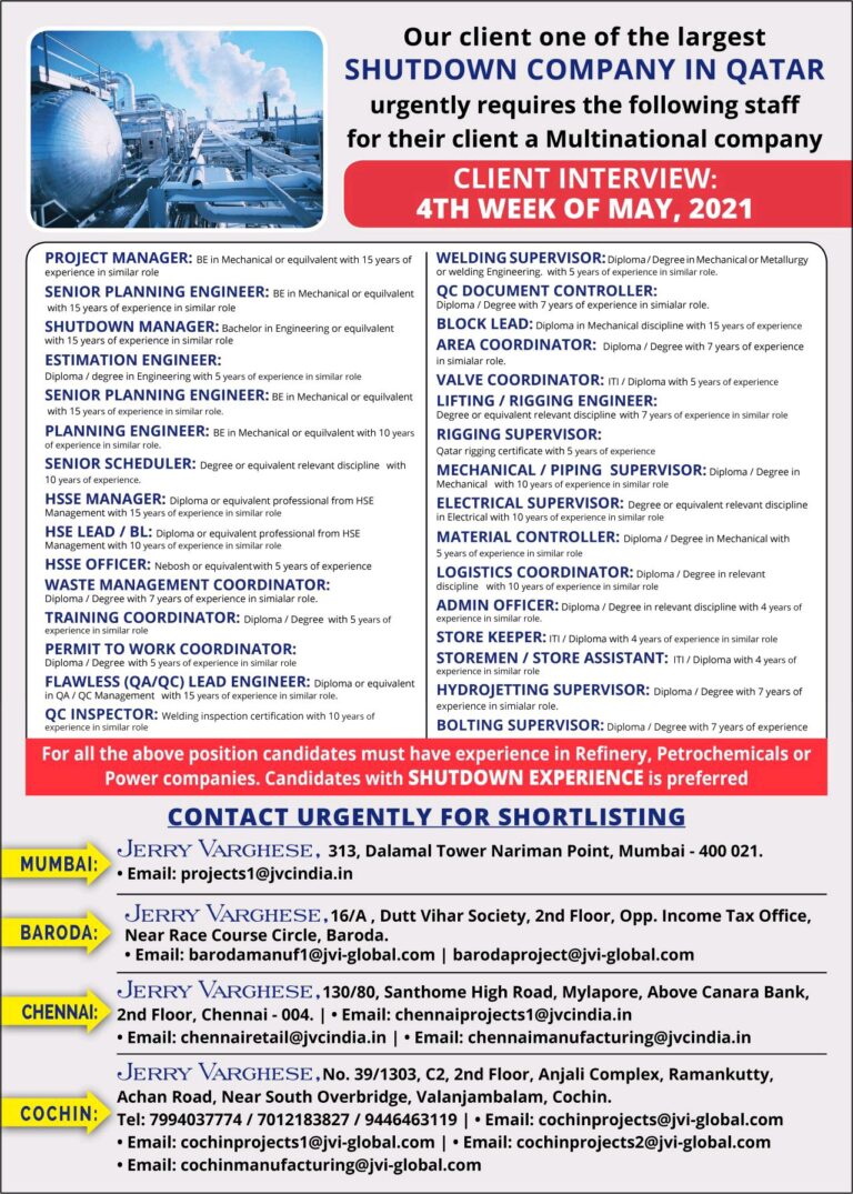 QATARAN INTERNATIONAL COMPANY REQUIRES FORFREETHEIR SHELL SHUTDOWN PROJECTSHORTLISTING IN PROGRESSCLIENT INTERVIEW WILL BE HELD SHORTLY ATMUMBAI, CHENNAI, KOCH’, BARODA, VIZAGFOREMAN …