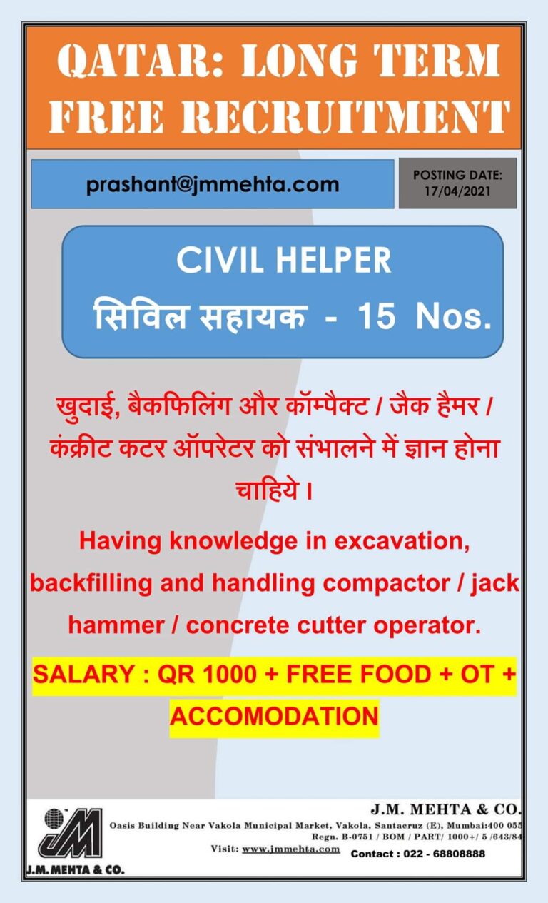 QATAR: LONG TERMFREE RECRUITMENTprashant@jmmehta.comPOSTING DATE:17/04/2021CIVIL HELPER 15 Nos.Having knowledge in excavation,back filling and handling compactor I jackhammer I concrete cutter …