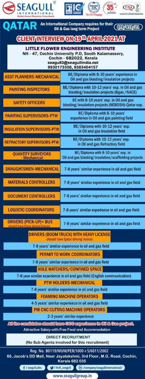 QATARAn International Company requires for theirQTR/019/21Oil & Gas long term ProjectCLIENT INTERVIEW ON 19 APRIL 2021 ATLITTLE FLOWER ENGINEERING INSTITUTENH …