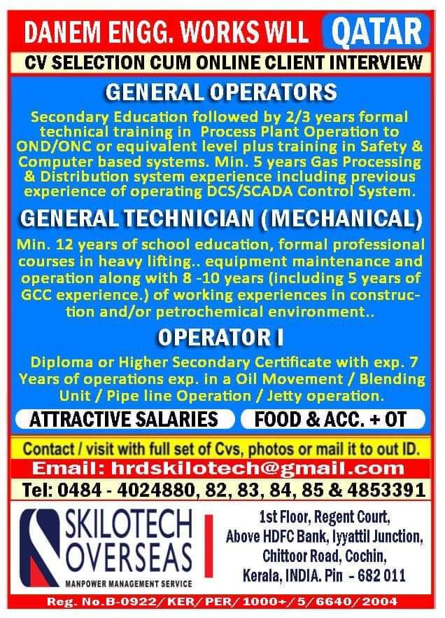 DANEM ENGG. WORKSWLL QATARCV SELECTION CUM ONLINE CLIENT INTERVIEWGENERAL OPERATORSSecondary Education followed by 2/3 years formaltechnical training in Process Plant …