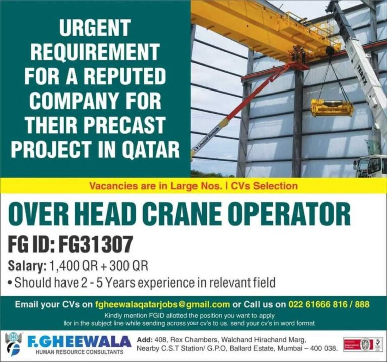URGENT REQUIREMENTFORA REPUTEDCOMPANY FORTHEIR PRECASTPROJECT IN QATARVacancies are in Large Nos. I CVs SelectionOVER HEAD CRANE OPERATORFG ID: FG31307salary: 1 …