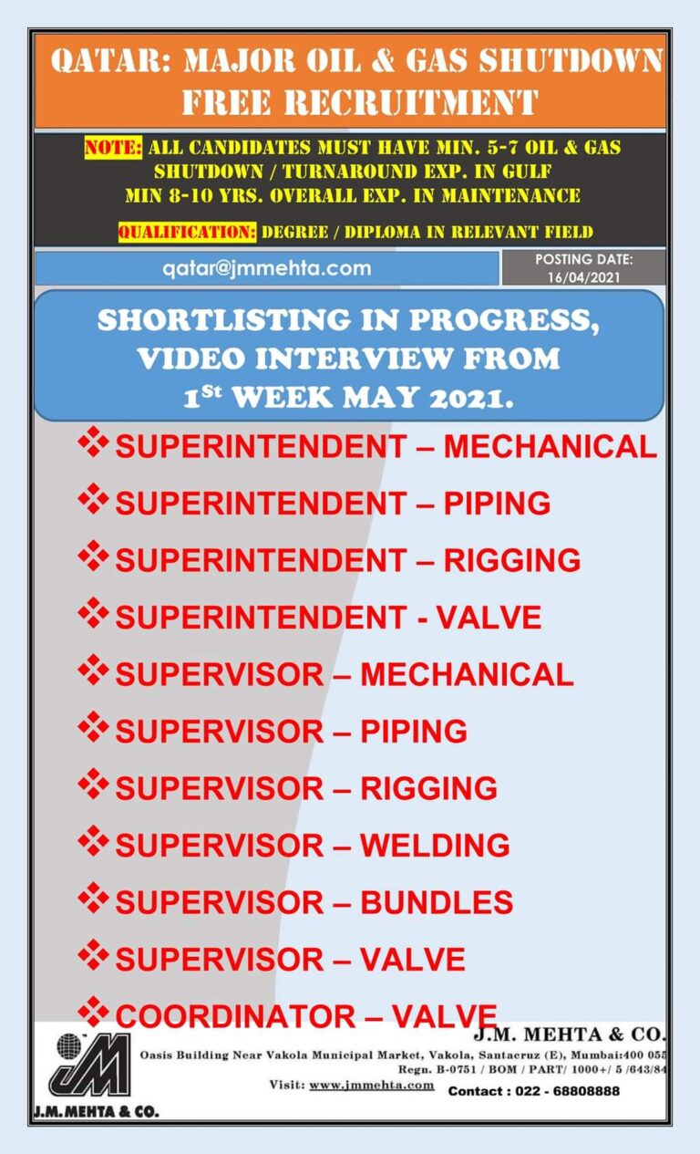 QATAR : SHORT TERM VACANCYSEND YOUR UPDATED RESUME, EXPERIENCE & QUALIFICATIONCERTIFICATES ALONG WITH VALID SKYPE ID / IMO NO.qatar@jmmehta.comPTW – …