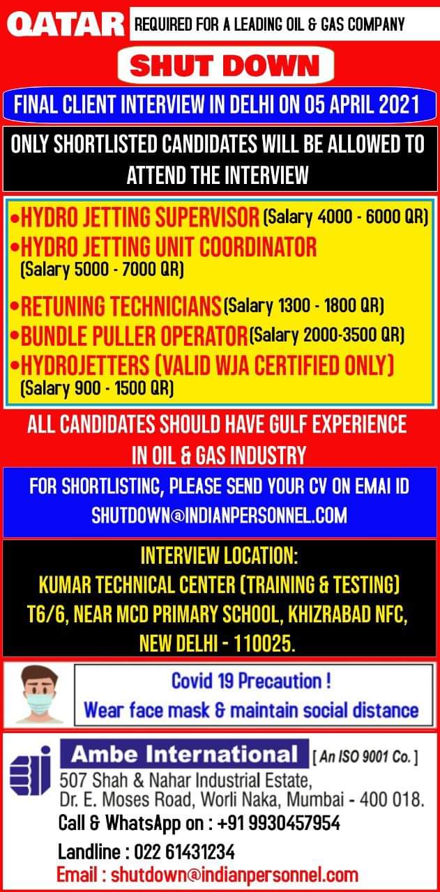 QATARREQUIRED FOR A LEADING OIL 8 COMPANYSHUT DOWNFINAL CLIENT INTERVIEW IN DELHI ON 05 APRIL 2021ONLY SHORTLISTED CANDIDATES WILL BE …