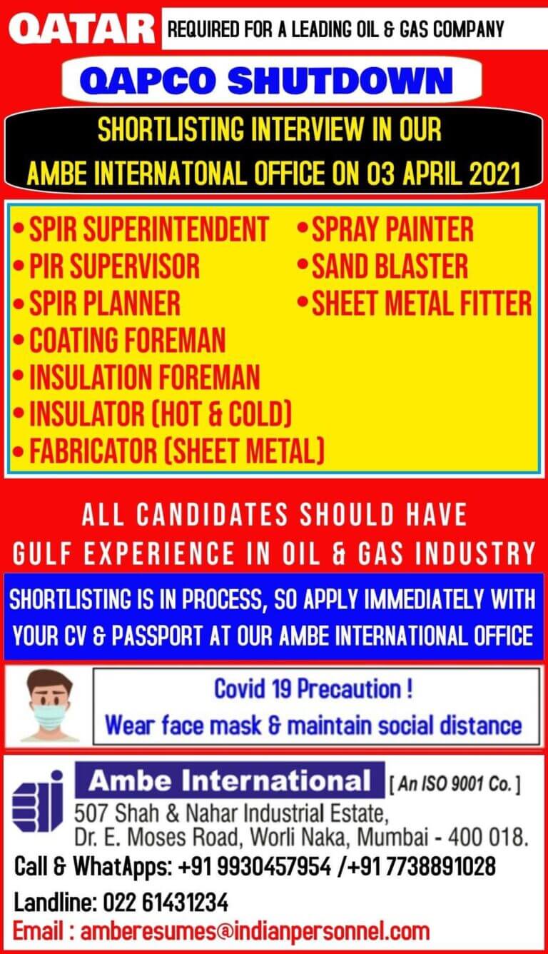 REQUIRED FOR A LEADING OIL & GAS COMPANYQAPCO SHUTDOWNSHORTLISTING INTERVIEW IN OUR AMBE INTERNATONAL OFFICE ON 03 APRIL 2021_• SPIR …
