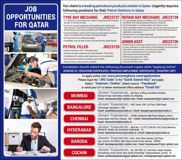 Our client is a leading petroleum products retailer in Qatar. Urgently requiresJOBfollowing positions for their Petrol Stations in QatarOPPORTUNITIESTYRE BAY …
