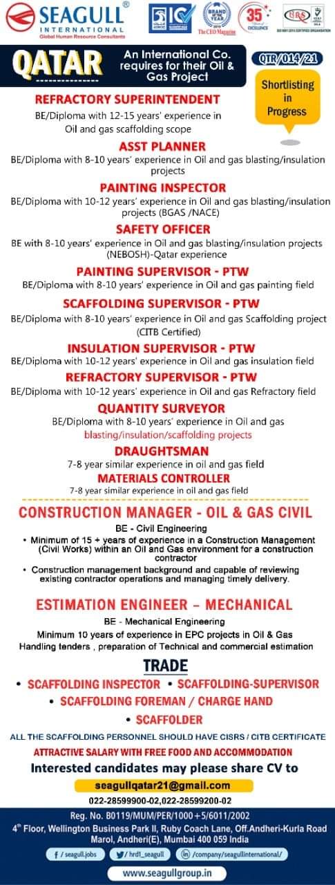 QATAR An International CoREFRACTORY SUPERINTENDENT BE/Diploma with 12-15 years. experience in Oil and gas scaffolding scope ASST PLANNER BE/Diploma with …
