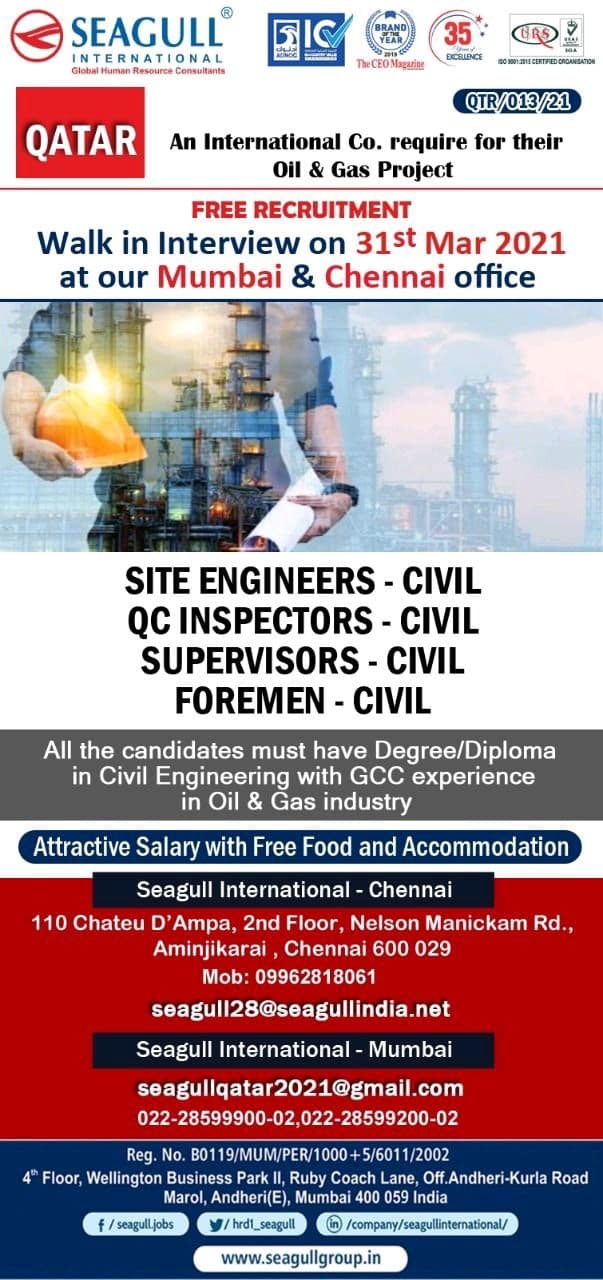 QATAR An International Co. require for theirOil & Gas ProjectFREE RECRUITMENTWalk in Interview on 31st Mar 2021at our Mumbai & …