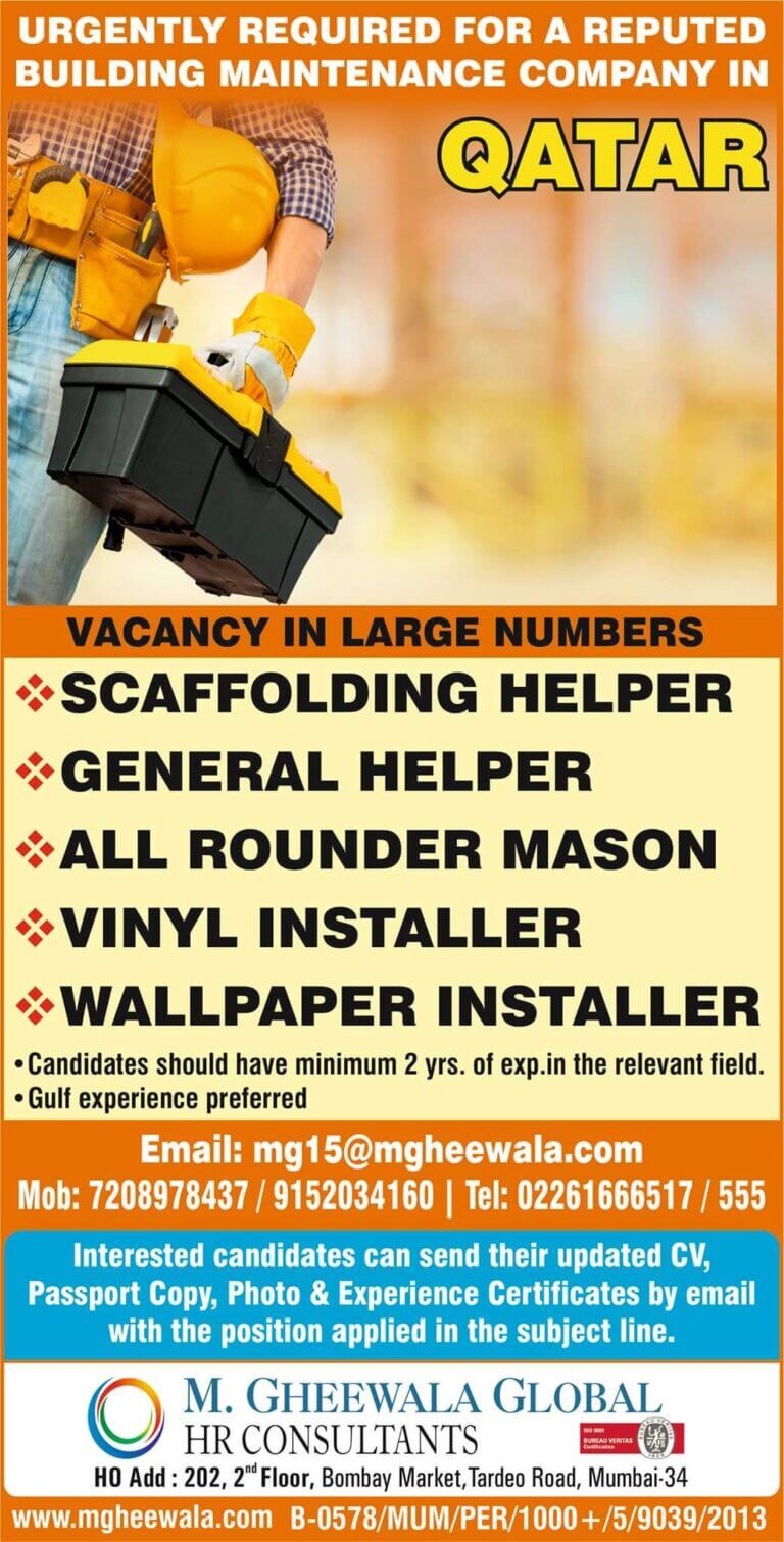 URGENTLY REQUIRED FOR A REPUTED BUILDING MAINTENANCE COMPANY IN QATARVACANCY IN LARGE NUMBERS SCAFFOLDING HELPER GENERAL HELPER *ALL ROUNDER MASON …