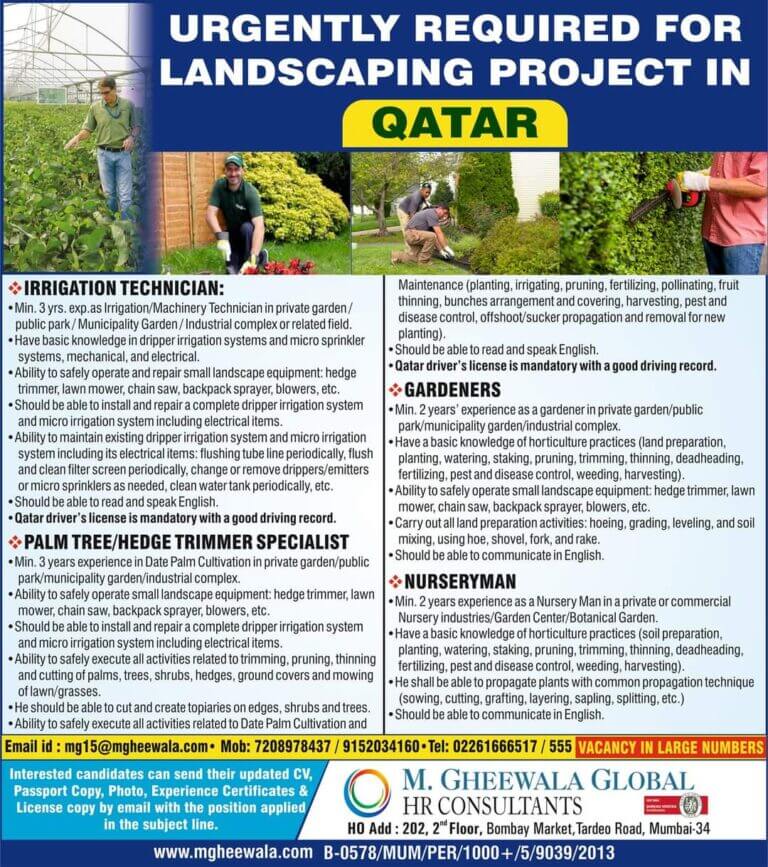 URGENTLY REQUIRED FOR LANDSCAPING PROJECT IN QATARIRRIGATION TECHNICIAN:Maintenance (planting, irrigating, pruning, fertilizing, pollinating fruit • Min. 3 yrs. exp.as Irrigation/Machinery …