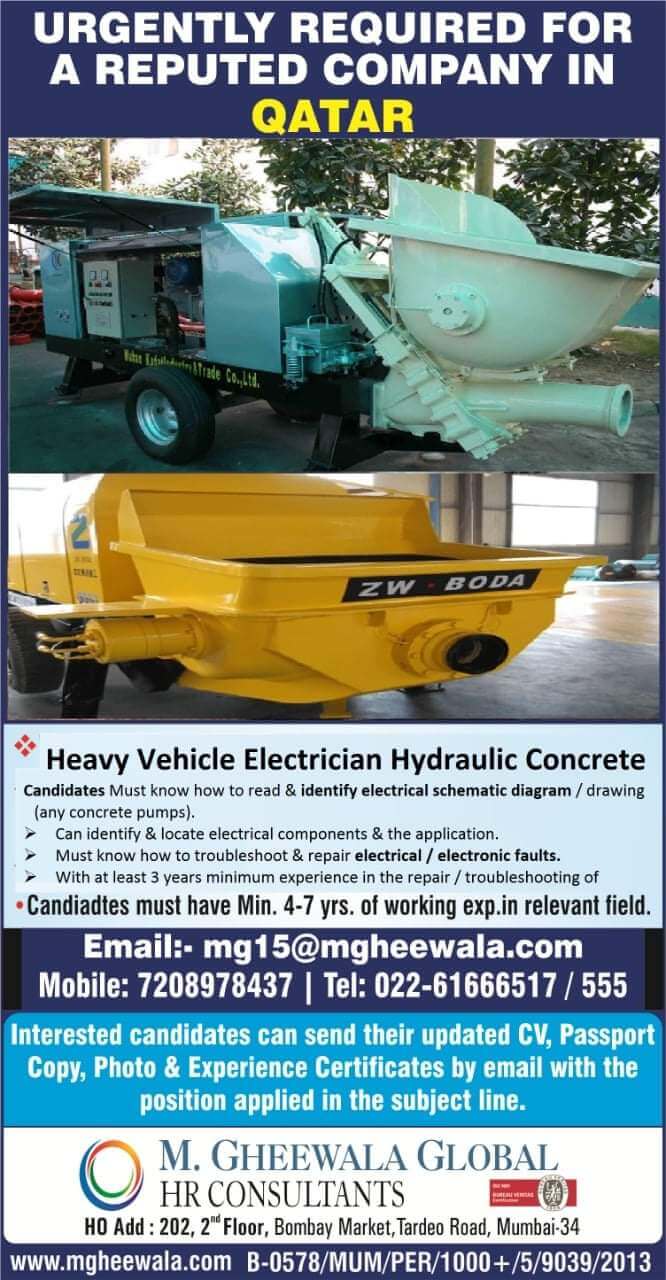 URGENTLY REQUIRED FOR A REPUTED COMPANY IN QATAR Heavy Vehicle Electrician Hydraulic Concrete Candidates Must know how to read & …