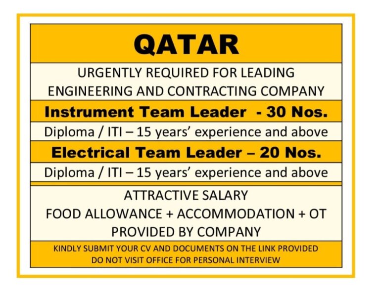 QATARURGENTLY REQUIRED FOR LEADINGENGINEERING AND CONTRACTING COMPANYInstrument Team Leader – 30 Nos. Apply here Diploma / ITI — 15 years’ …