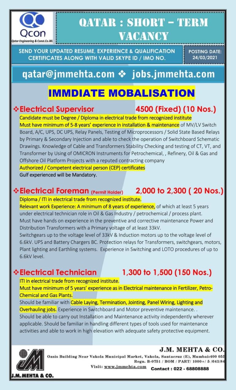 QconEngineering & Const.Co.WLQATAR : SHORT – TERMVACANCYSEND YOUR UPDATED RESUME, EXPERIENCE & QUALIFICATIONCERTIFICATES ALONG WITH VALID SKYPE ID / IMO …