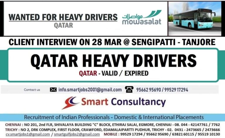 CLIENT INTERVIEW ON 28 MAR @ SENGIPAITI – TANJOREQATAR HEAW DRIVERSContact usQATAR – VALID/ EXPIRED95662 95690 / 9952917294info.smartjobs2001@gmail.comSmart ConsultancyReeruitment of …