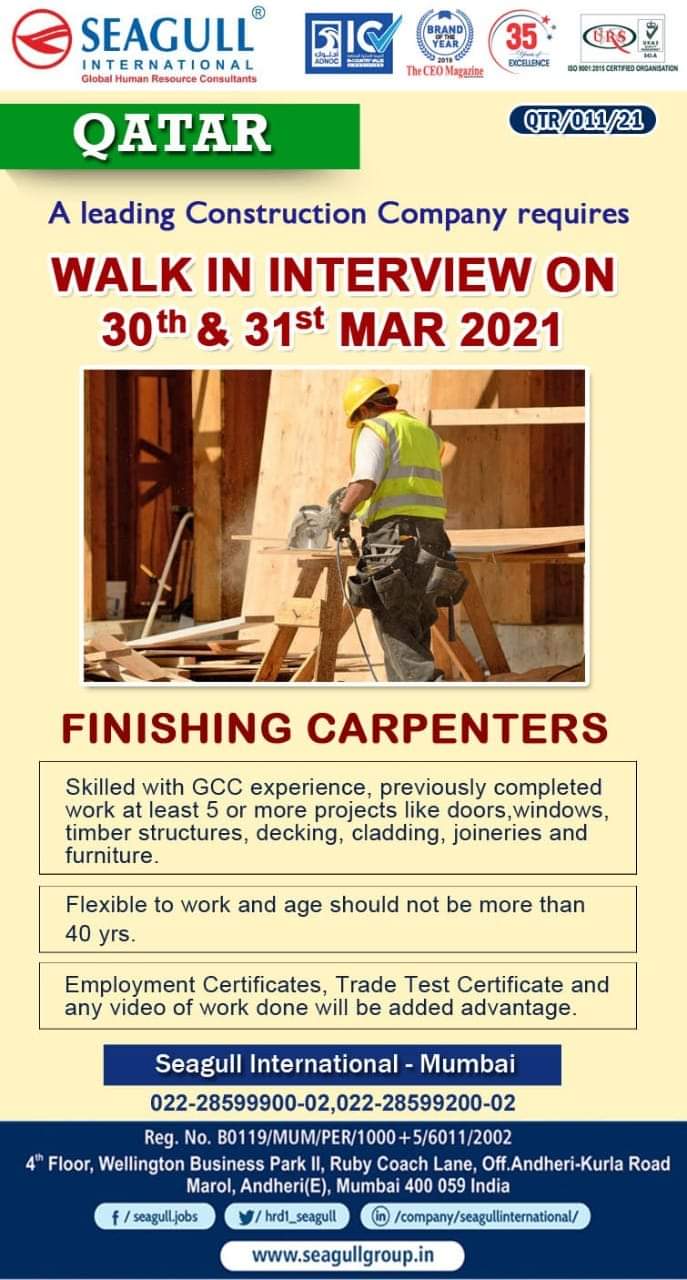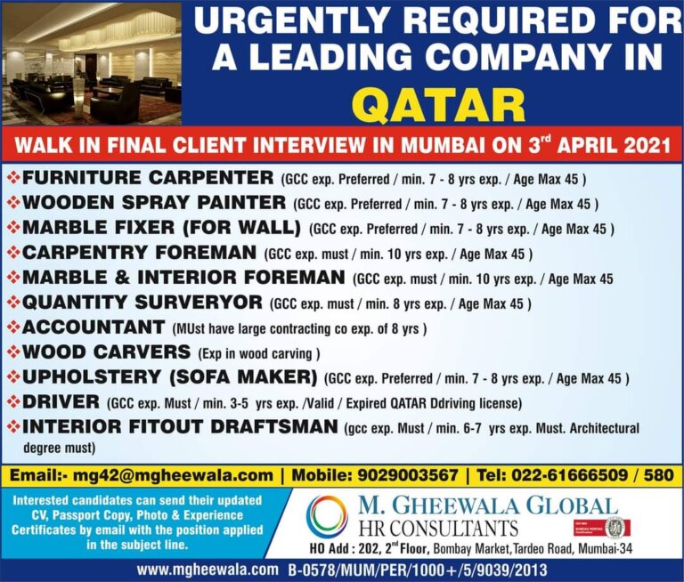 A LEADING COMPANY IN QATARWALK IN FINAL CLIENT INTERVIEW IN MUMBAI ON 3rd APRIL 2021•FURNITURE CARPENTER exp. Preferred / min. …