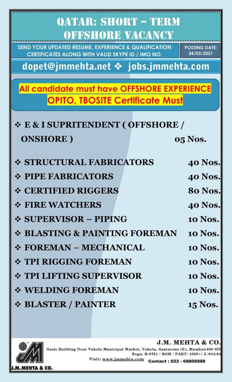 QATAR: SHORT – TERMOFFSHORE VACANCYSEND YOUR UPDATED RESUME, EXPERIENCE & QUALIFICATIONCERTIFICATES ALONG WITH VALID SKYPE ID / IMO NO.POSTING DATE:24/03/2021dopet@jmmehta.net …