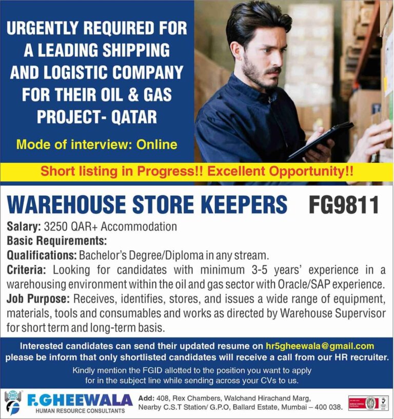 URGENTLY REQUIRED FORA LEADING SHIPPINGAND LOGISTIC COMPANYFOR THEIR OIL & GASPROJECT- QATARMode of interview: OnlineShort listing in Progress!! Excellent Opportunity!!WAREHOUSE …