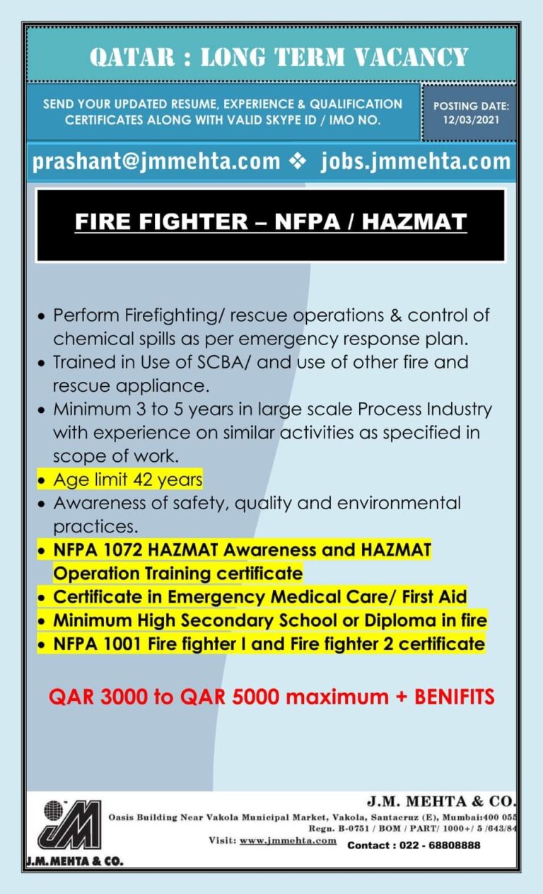 QATAR : LONG TDRM VACANCYSEND YOUR UPDATED RESUME, EXPERIENCE & QUALIFICATIONCERTIFICATES ALONG WITH VALID SKYPE ID / IMO NO.POSTING DATE:12/03/2021prashant@jmmehta.com …