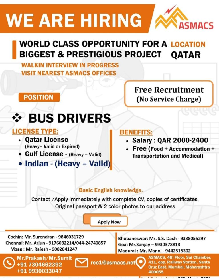 WE ARE HIRINGASMACSWORLD CLASS OPPORTUNITY FOR A LOCATIONBIGGEST & PRESTIGIOUS PROJECT QATARWALKIN INTERVIEW IN PROGRESSVISIT NEAREST ASMACS OFFICESPOSITIONBUS DRIVERSLICENSE TYPE:Qatar …