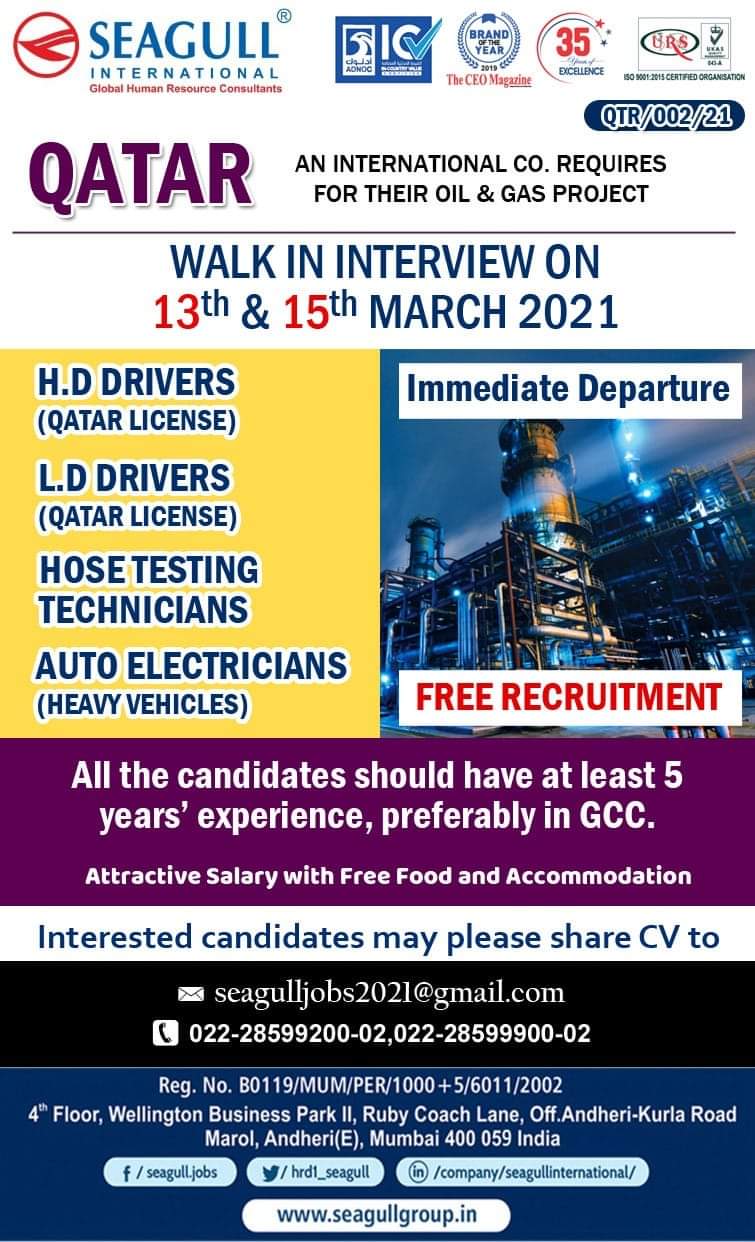 QATARAN INTERNATIONAL CO. REQUIRESFOR THEIR OIL & GAS PROJECTWALK IN INTERVIEW ON13th & 15th MARCH 2021H.D DRIVERS(QATAR LICENSE)L.D DRIVERS(QATAR LICENSE)HOSETESTINGTECHNICIANSAUTO …