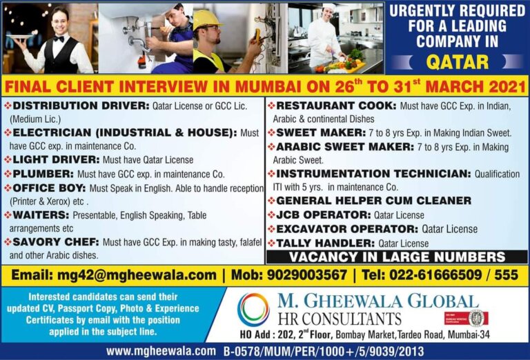 URGENTLY REQUIRED FOR A LEADINGCOMPANY IN QATARFINAL CLIENT INTERVIEW IN MUMBAI ON 26th TO 31st MARCH 2021•DISTRIBUTION DRIVER: Qatar License …