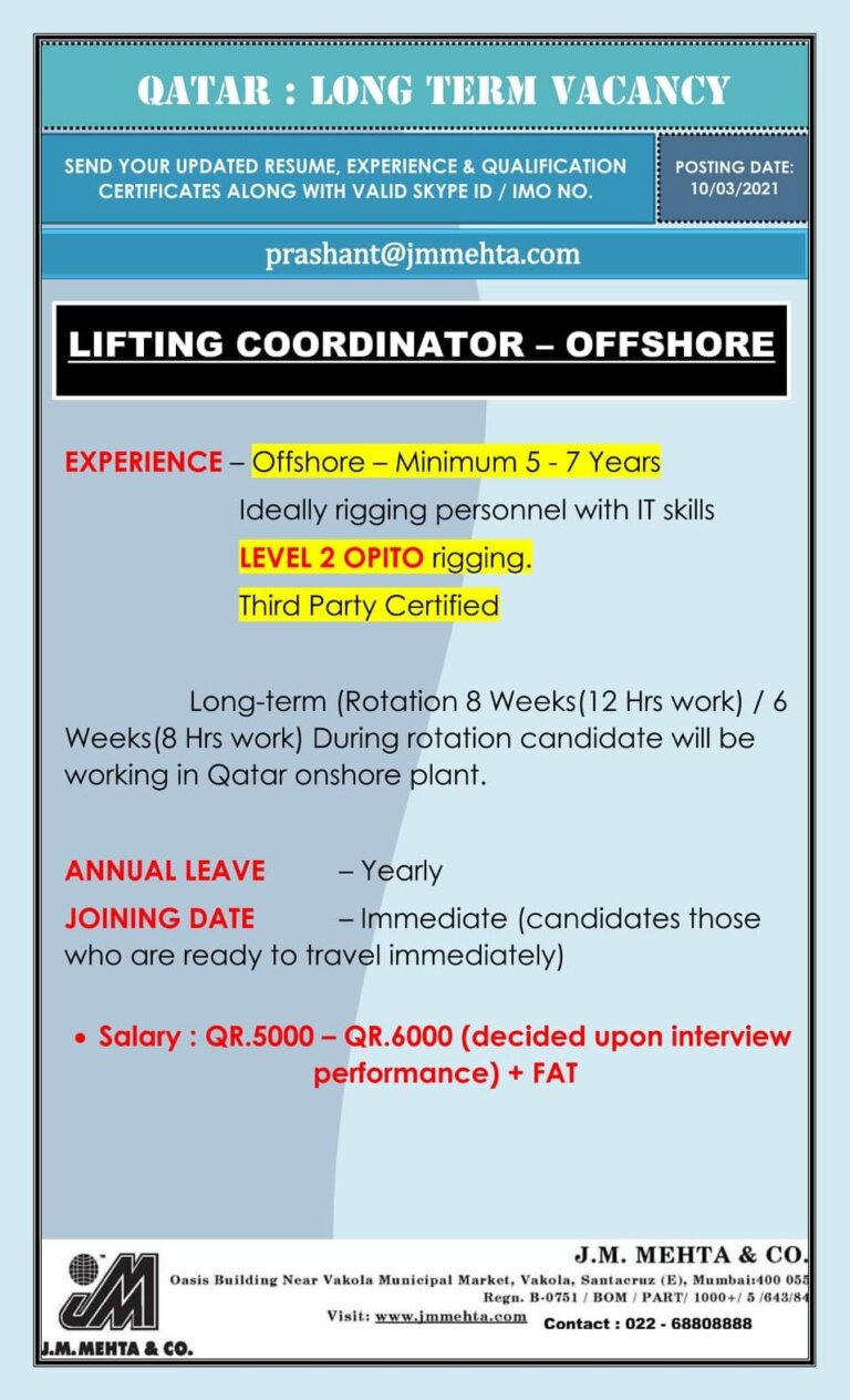 QATAR : LONG TERM VACANCYSEND YOUR UPDATED RESUME, EXPERIENCE & QUALIFICATIONCERTIFICATES ALONG WITH VALID SKYPE ID / IMO NO.prashant@jmmehta.comPOSTING DATE:10/03/2021LIFTING …