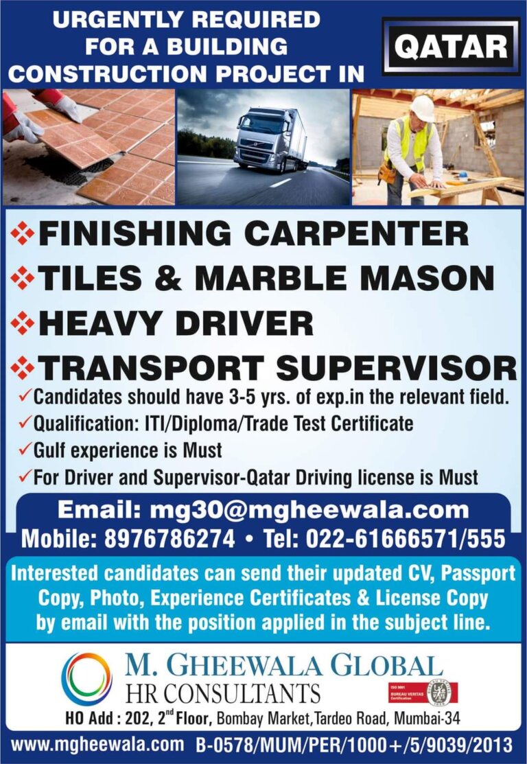 URGENTLY REQUIRE QATARFOR A BUILDINGCONSTRUCTION PROJECT INFINISHING CARPENTERTILES & MARBLE MASONHEAVY DRIVERTRANSPORT SUPERVISORCandidates should have 3-5 yrs. of exp.in the …