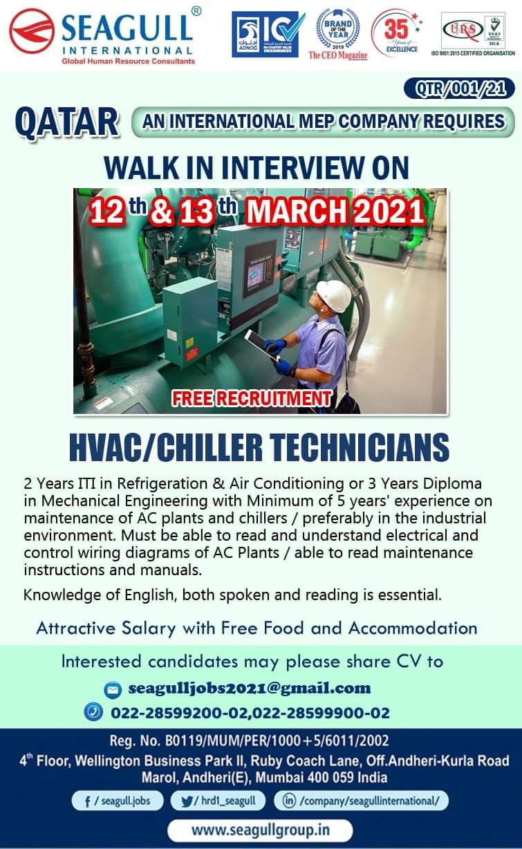 FREE RECRUITMENTHVAC/CHILLER TECHNICIANS2 Years ITI in Refrigeration & Air Conditioning or 3 Years Diplomain Mechanical Engineering with Minimum of 5 …