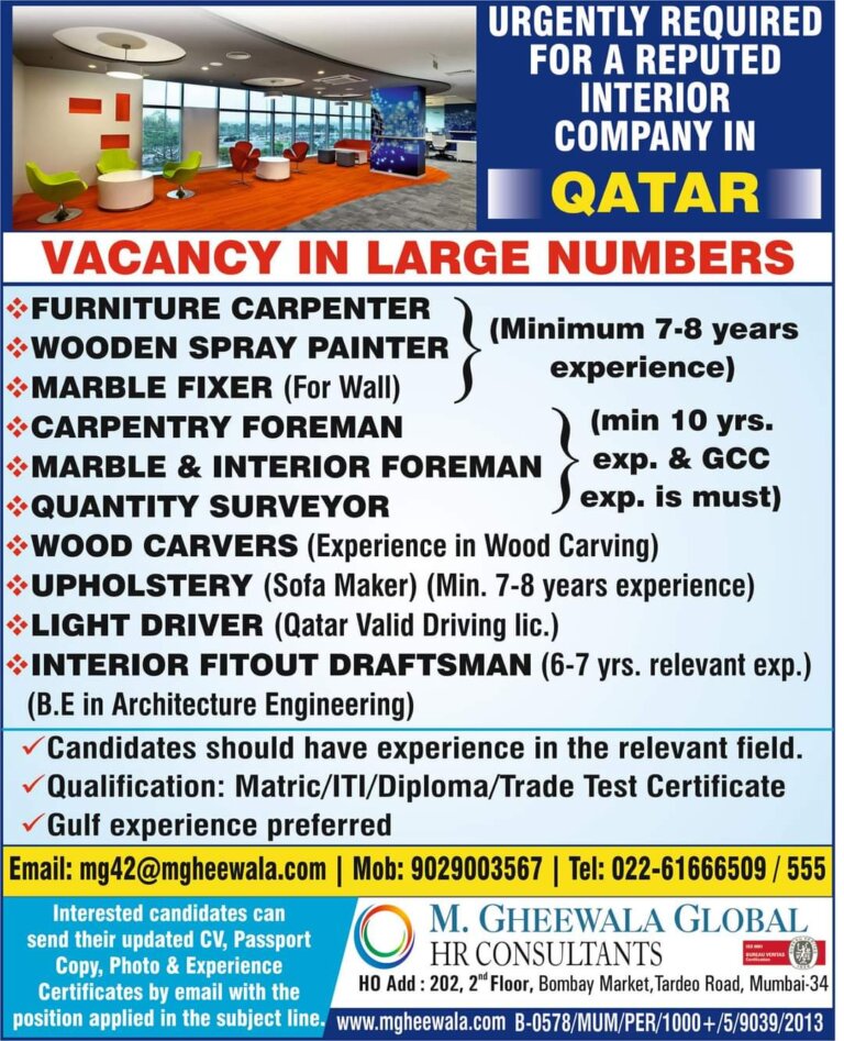URGENTLY REQUIREDFOR A REPUTEDINTERIORCOMPANY INQATARVACANCY IN LARGE NUMBERS•FURNITURE CARPENTER(Minimum 7-8 yearsWOODEN SPRAY PAINTERMARBLE FIXER (For wall)•CARPENTRY FOREMANexperience)(min 10 yrs.MARBLE & …