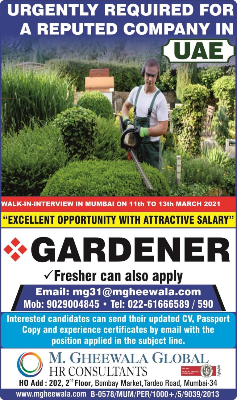 URGENTLY REQUIRED FORA REPUTED COMPANY INUAEWALK-IN-INTERVIEW IN MUMBAI ON 11th TO 13th MARCH 2021“EXCELLENT OPPORTUNITY WITH ATTRACTIVE SALARY”GARDENERV Fresher can …