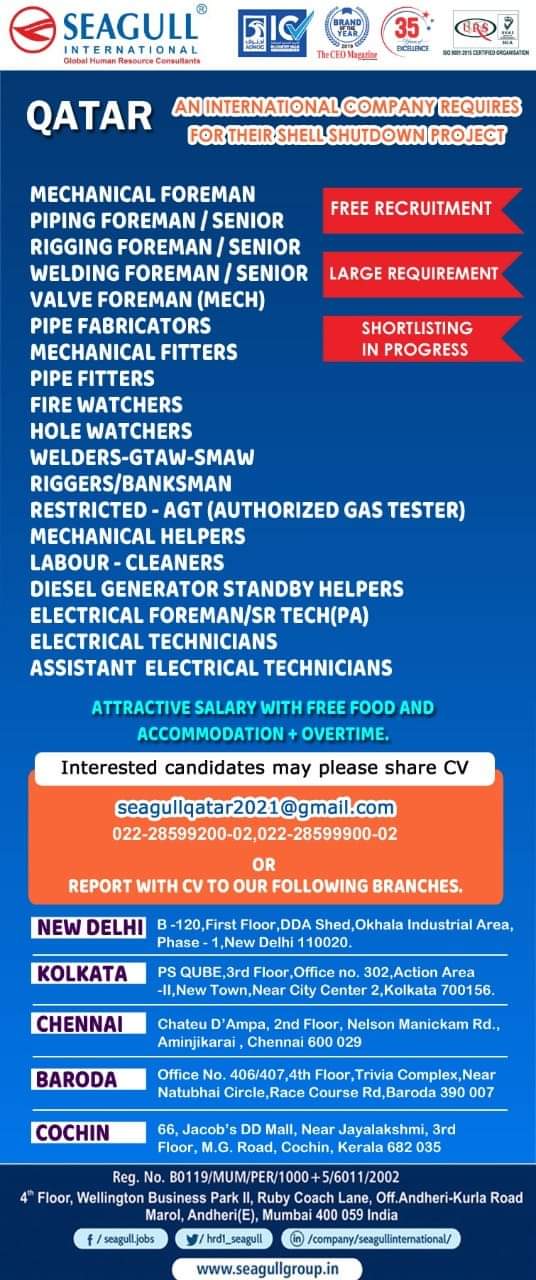 QATARMECHANICAL FOREMANREE RECRUITMENTPIPING FOREMAN I SENIORRIGGING FOREMAN I SENIORWELDING FOREMAN 1 SENIORRGE REQUIREMENTVALVE FOREMAN (MECH)PIPE FABRICATORSMECHANICAL FITTERSPIPE FITTERSFIRE WATCHERSHOLE WATCHERSWELDERS-GTAW-SMAWRIGGERS/BANKSMANSHORTLISTING• …