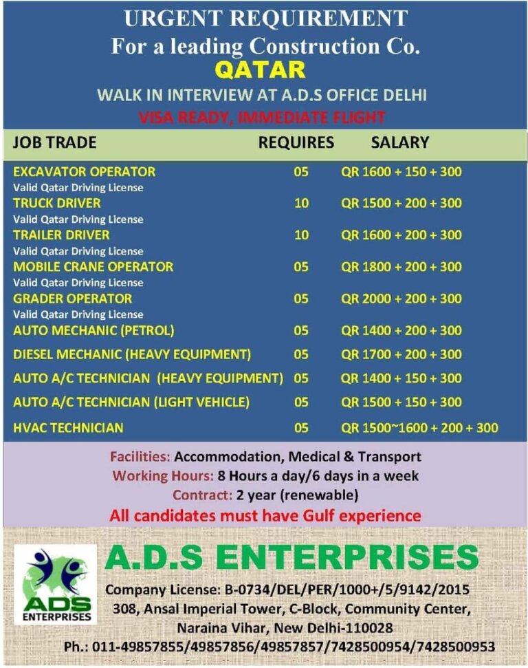 URGENT REQUIREMENTFor a leading Construction Co.QATARWALK IN INTERVIEW AT A.D.S OFFICE DELHIJOB TRADEEXCAVATOR OPERATORValid Qatar Driving LicenseTRUCK DRIVERValid Qatar Driving …
