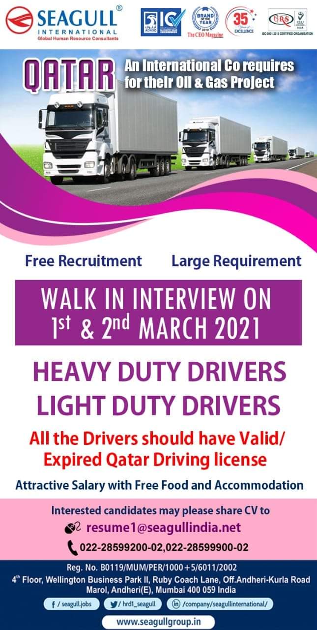 An International Co requiresfor their Oil a Gas ProjectFree RecruitmentLarge RequirementWALK IN INTERVIEW ON& 2nd MARCH 2021HEAVY DUTY DRIVERSLIGHT DUTY …